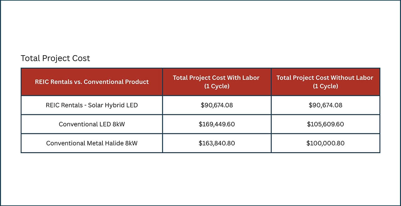 Monthly cost savings varied based on labor requirements for operating conventional light towers. Even after rental costs, the project consistently achieved significant monthly savings with REIC Rentals’ Solar Hybrid Light Towers.