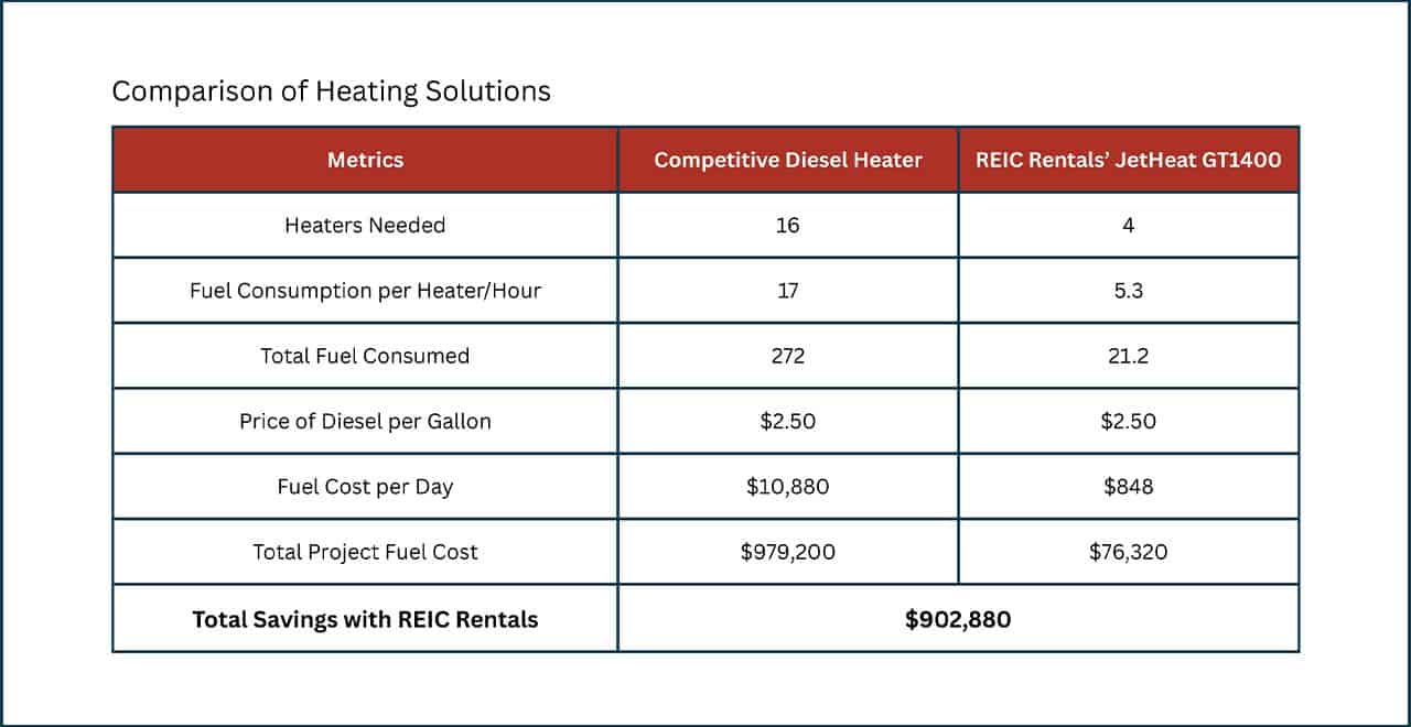 Despite record-low winter temperatures, REIC Rentals’ heating solution allowed the project to continue without delays. The flameless heaters delivered consistent heat without the need for external power sources and safely met all emissions and regulatory requirements.